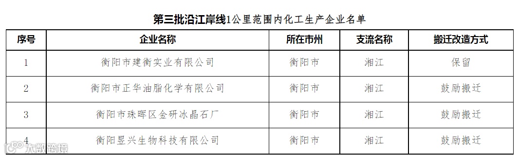 根据公告,衡阳市建衡实业有限公司等4家企业列入湖南省第三批沿江化工生产企业名单。