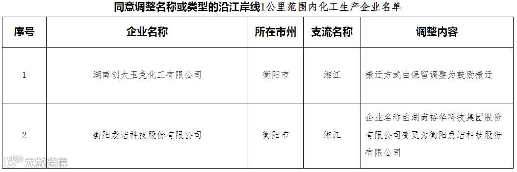 此外,第一批沿江化工企业中的保留类企业湖南创大玉兔化工有限公司同意调整为鼓励搬迁类,湖南裕华科技集团股份有限公司同意变更为衡阳爱洁科技股份有限公司。