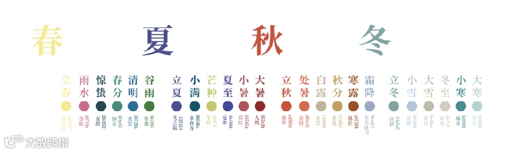 设计团队分析了24个节气与对应3候的关系,明确节气主题色,通过字画书法设计与生活四季去感悟生活间的微妙变化。