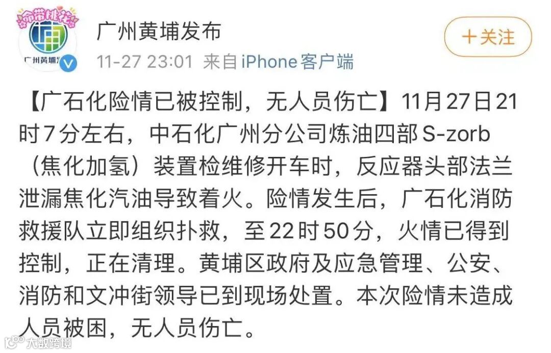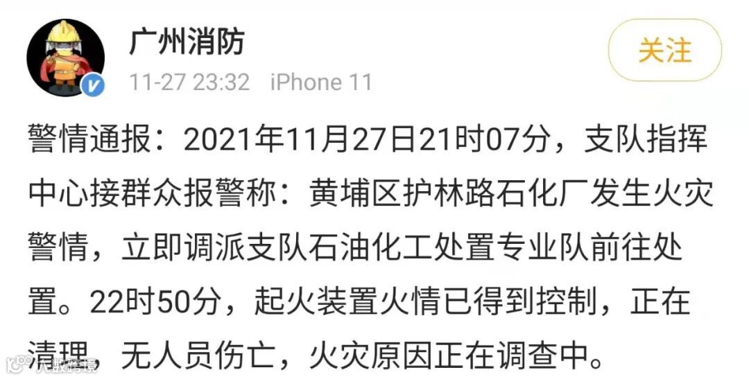 昨晚23时32分,广州消防发布的警情通报:2021年11月27日21时07分,支队指挥中心接群众报警称:黄埔区护林路石化厂发生火灾警情,立即调派支队石油化工处置专业队前往处置。22时50分,起火装置火情已得到控制,正在清理,无人员伤亡,火灾原因正在调查中。