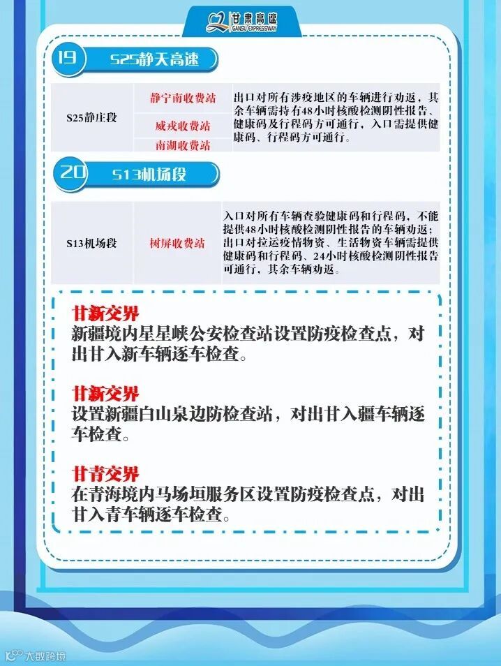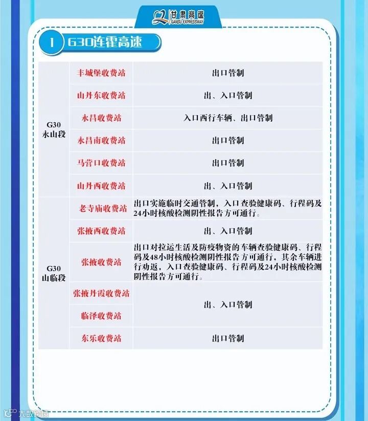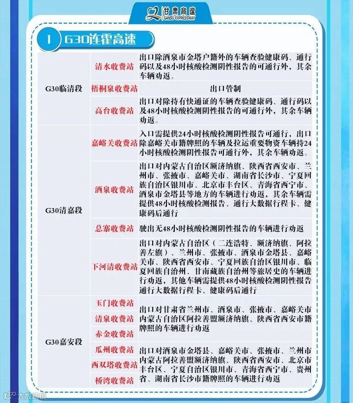 1、G6京藏高速,平西路段平安收费站入口车辆监测人员登记后进入高速;出口车辆持48小时核酸检测报告、扫两码后通行,西宁车辆劝返。高寨匝道入口交通管制。