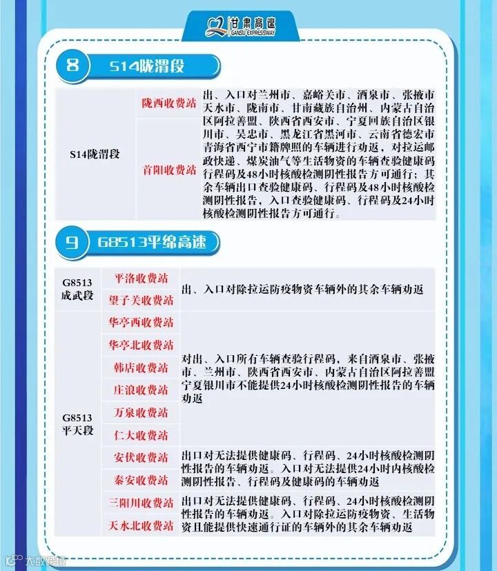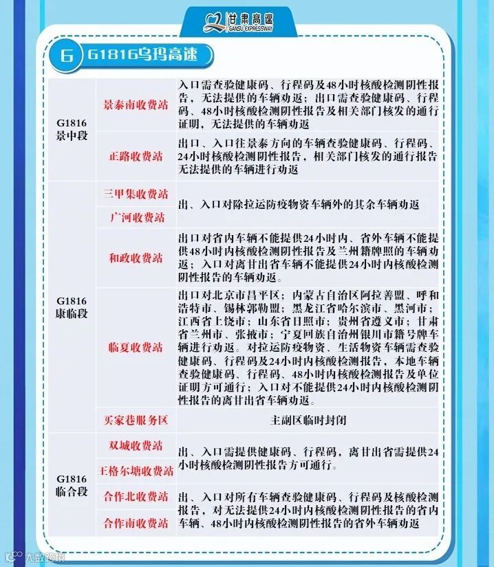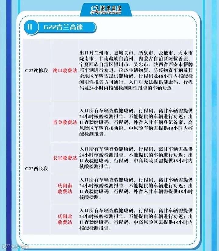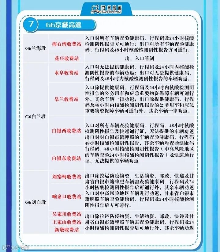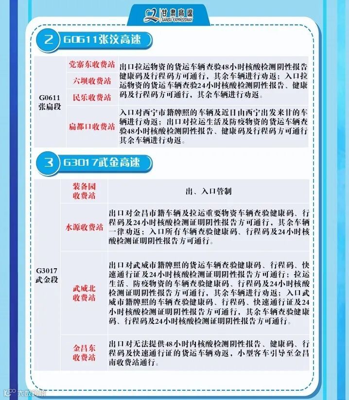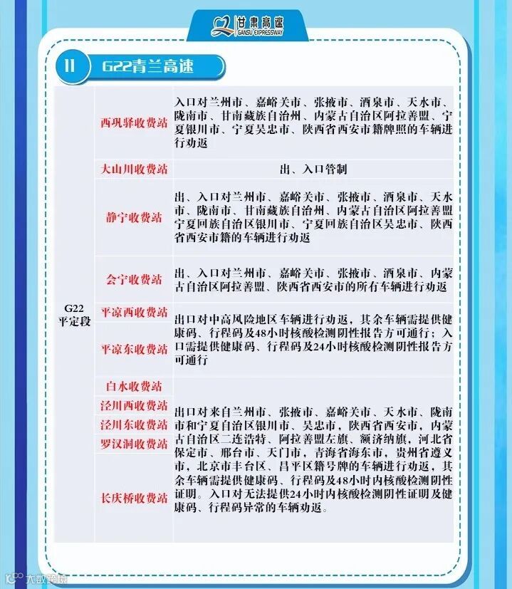 2、G6京藏高速,马平路段马场垣匝道收费站出口对行程码显示西宁的车辆进行劝返、乐都收费站,出口对西宁来的车辆进行劝返,乐都本地户口车辆、运送生活生产物资(非中高风险地区)车辆持48小时核酸检测报告和双码通行、民和收费站出口对西宁方向来的车辆全部劝返。