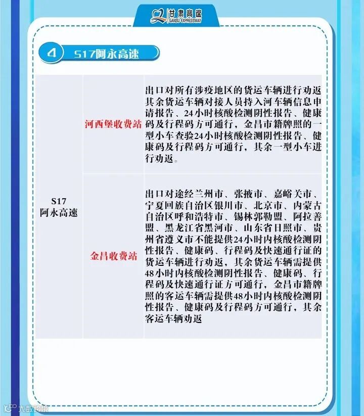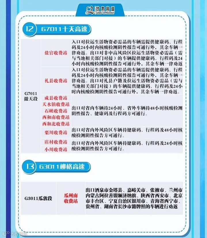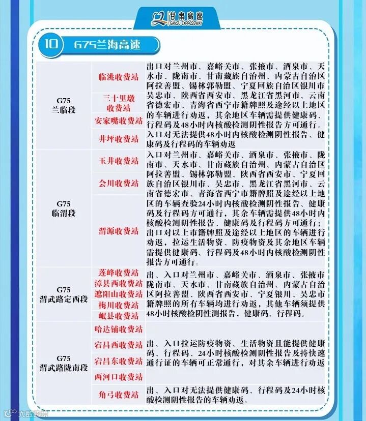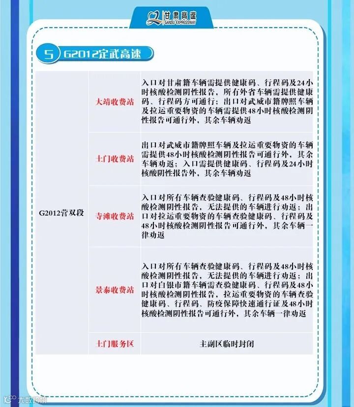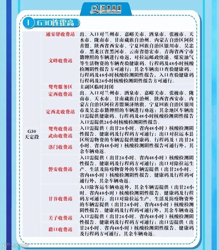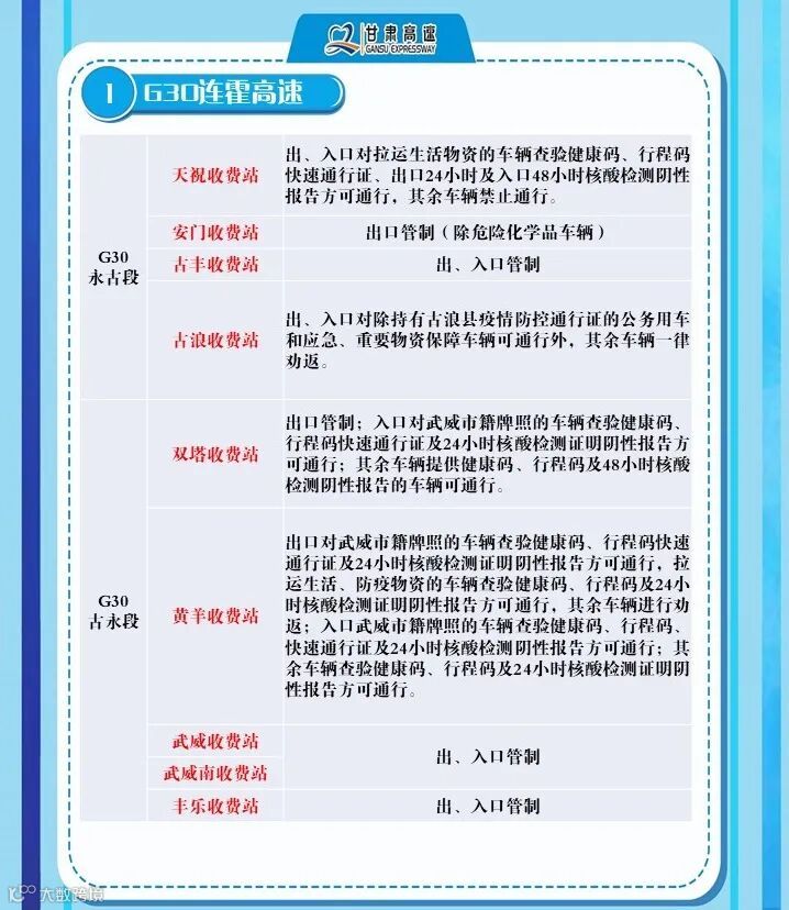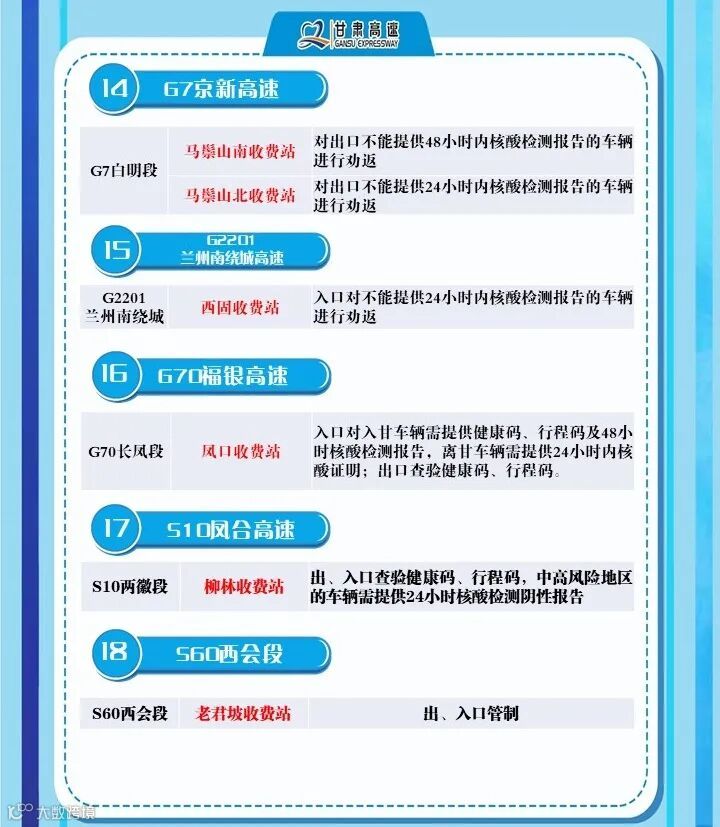 2、G6京藏高速,马平路段马场垣匝道收费站出口对行程码显示西宁的车辆进行劝返、乐都收费站,出口对西宁来的车辆进行劝返,乐都本地户口车辆、运送生活生产物资(非中高风险地区)车辆持48小时核酸检测报告和双码通行、民和收费站出口对西宁方向来的车辆全部劝返。