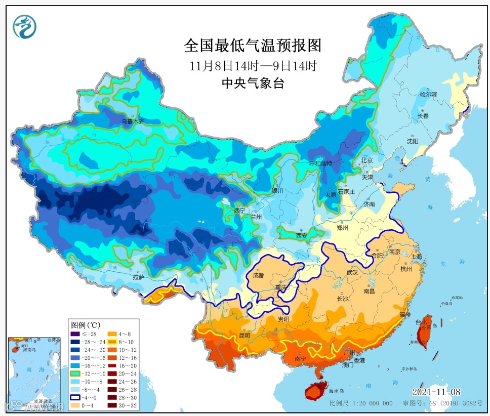 11月8日8时,中央气象台继续发布寒潮蓝色预警、大风黄色预警和暴雪橙色预警。