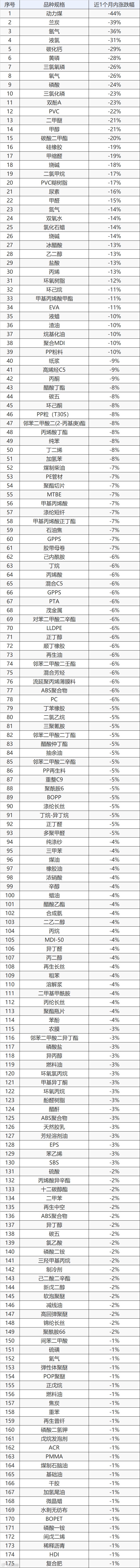 另外,以煤炭为燃料的次级下游产品,如无机化工、磷化工的相关产品,近1个月内的跌幅超过20%。