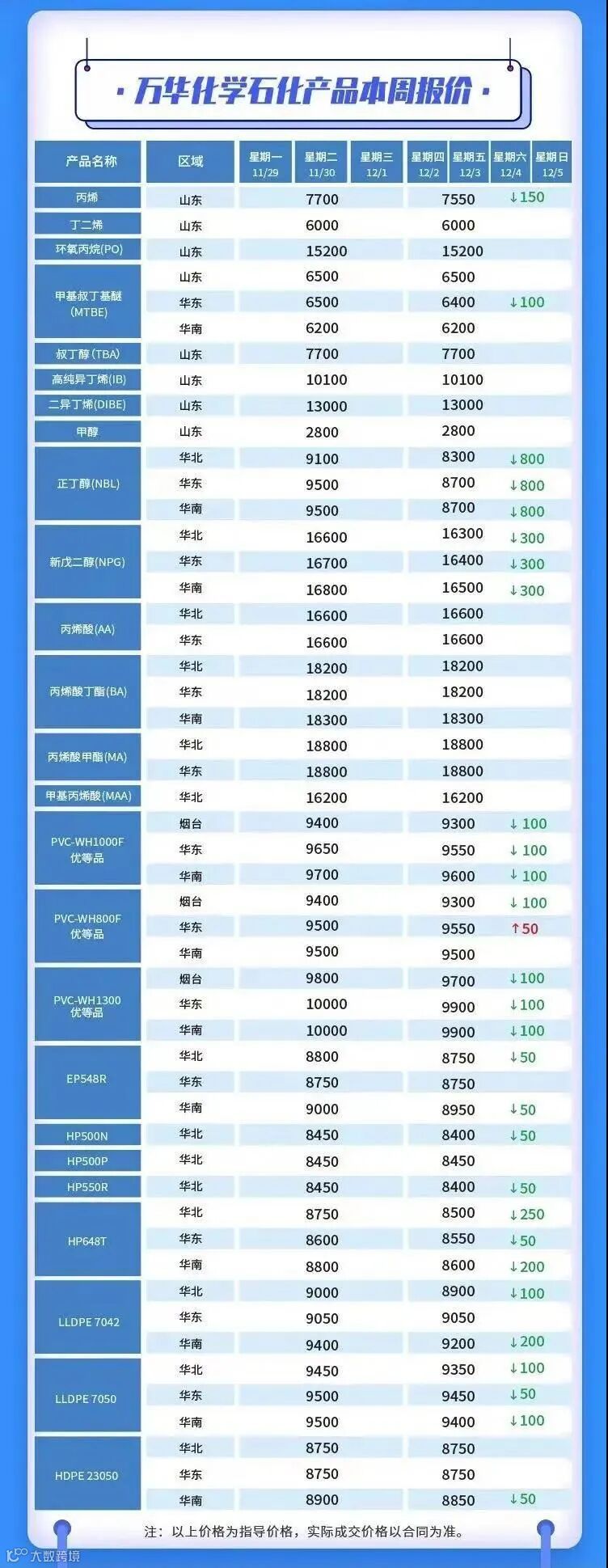 近日,万华化学发布产品报价表,多种产品价格有所下滑且力度较大。其中正丁醇华南区域报价8500元/吨,较月初报价下跌1000元/吨,新戊二醇华北区域报价15800元/吨,较月初下跌800元/吨;高纯异丁烯报价9750元/吨,较月初报价下跌350元/吨;甲基叔丁基醚报价6200元/吨,较月初报价下跌300元/吨;除此之外,丙烯、PVC等产品均出现了一定的下跌。