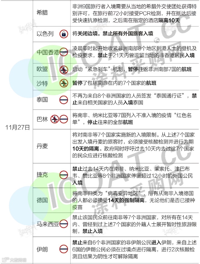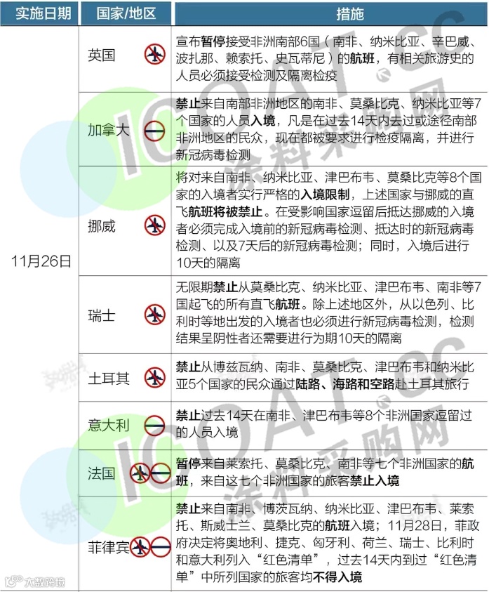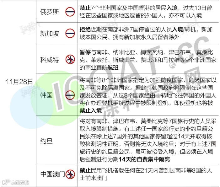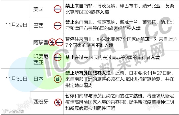 有媒体和专家将其形容为“迄今为止最糟糕的变异病毒”,多国已发布旅行禁令,美国紧急切断8国航班入境,英国、欧盟等多地已叫停来自非洲国家的航班。德国、意大利、荷兰、瑞士、丹麦等国宣布暂停非洲八国入境, 此外欧盟建议成员国都暂停所有往来南部非洲的航班。