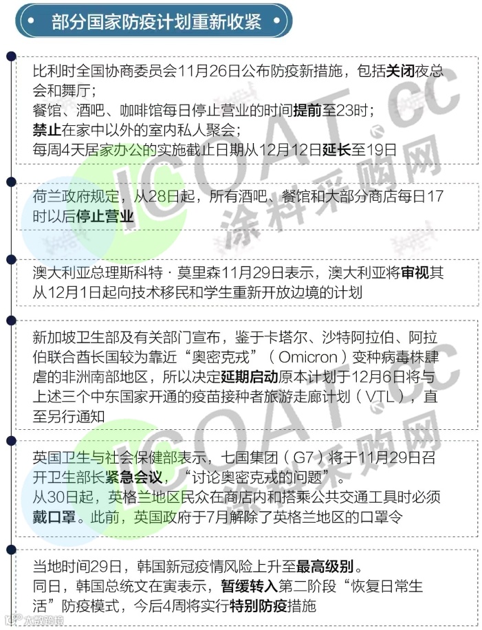 此外,“奥密克戎”新冠变异株的出现,让部分国家的防疫政策重新收紧。比利时、荷兰、英国加强了公共场所的防疫措施;澳大利亚、新加坡延期或考虑延期开放边境的计划;韩国将新冠疫情风险上升至最高级别,今后4周将实行特别防疫措施。