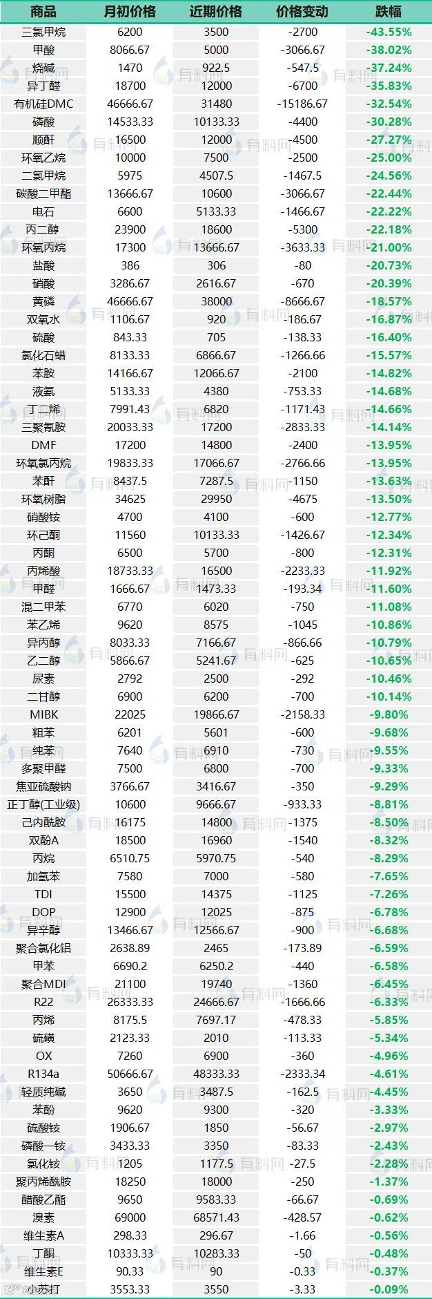 另外,黄磷、磷酸等化工品价格下跌超过1000元/吨。其中黄磷跌价8666.67元/吨,环氧树脂跌价4675元/吨,丙烯酸丁酯跌价3400元/吨,三聚氰胺跌价2833.33元/吨,新戊二醇跌价2800元/吨,环氧氯丙烷跌价2766.66元/吨,丙烯酸异辛酯跌价2500元/吨,DMF跌价2400元/吨,丙烯酸跌价2233.33元/吨……