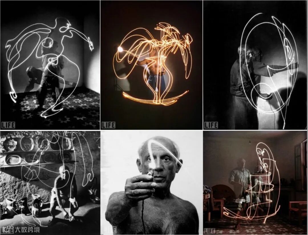 1949年,美国著名生活周刊《LIFE》的摄影师兼技术天才GjonMili在法国南部拜访了立体主义先驱大师——毕加索。并向其展示了一些实验性质的照片(画面是滑冰者穿着闪光的冰鞋在黑暗中做出各种跳跃动作),由此激发了毕加索的光绘灵感。于是便有了这一组著名的毕加索光绘作品。