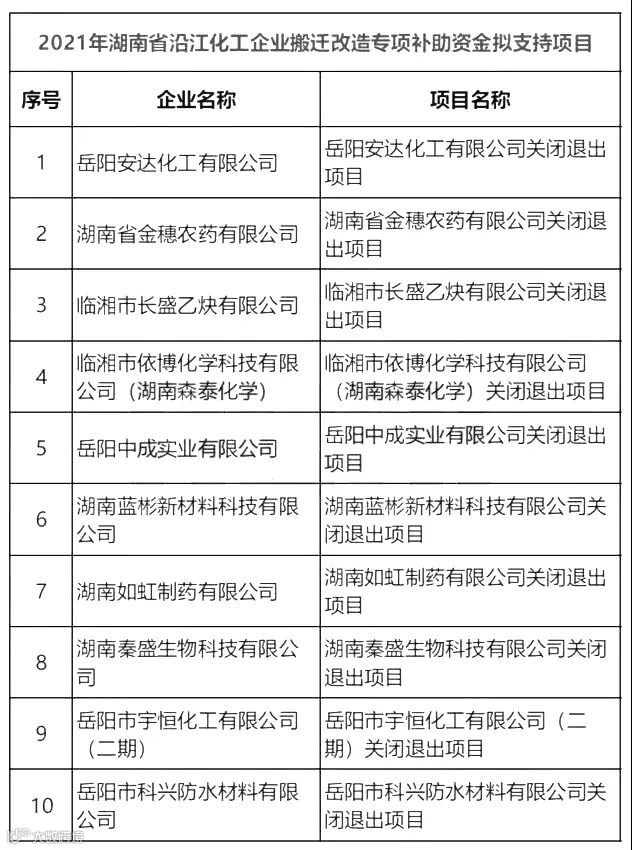 12月6日,湖南省工信厅公示了2021年省沿江化工企业搬迁改造专项补助资金拟支持项目。