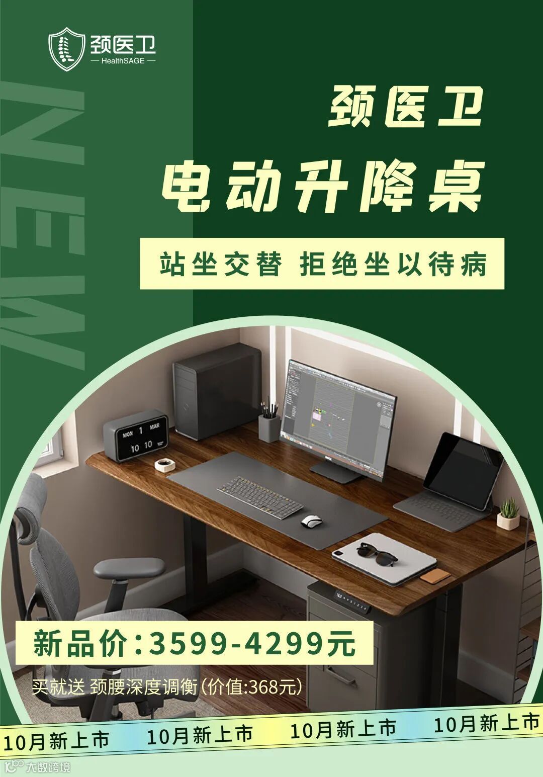 为了让大家事业、健康“双丰收”,颈医卫产品部特别找到了人体工学升降桌,有了它,只需轻轻一按,立刻由坐变站,真正实现坐站结合,轻松办公!