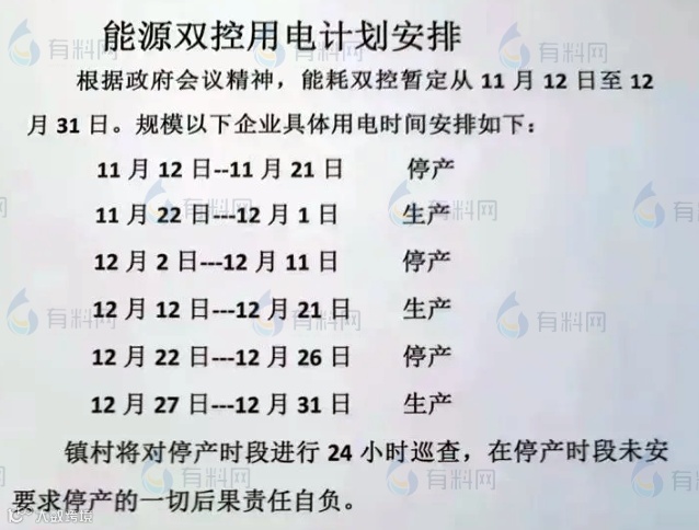 江苏南通某工厂表示接到通知,11月13日0点-21日24点正常生产,11月22日0点-11月30日停止生产,12月16日-12月31日24点停止生产。