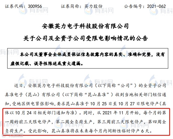 英力股份公告,全资子公司真准电子(昆山)有限公司收到当地相关部门短信通知,受地区供电紧张影响,从2021年11月开始,每个月的第一周的前三天限电停产,第二周全负荷生产,第三周前三天限电停产,第四周全负荷生产。受此影响,昆山真准将在未来每个月内间断性临时停产6天。另外,公司及全资子公司英力电子科技(重庆)有限公司也分别接到当地相关部门的电话和短信通知,要求每天按通知时间段将用电负荷控制在保留负荷以下。