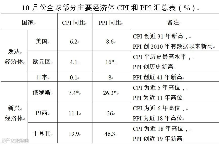 、 土耳其同比分别上涨6.2%、4.1%、7.4%、11.1%和19.9%。其中,美国创近31年新高,欧元区追平历史最高水平。从PPI看,10月份美国、欧元区(9月份)、日本、俄罗斯(9月份)、巴西、土耳其同比分别上涨8.6%、16%、8%、26.3%、26%和46.3%。其中,欧元区、日本分别创历史新高和近41年新高。