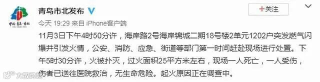 11月3日下午4时50分许,海岸路2号海岸锦城二期18号楼2单元1202户突发燃气闪爆并引发火情,公安、消防、应急、街道等部门第一时间赶赴现场进行处置。下午5时30分许,火被扑灭,过火面积25平方米左右,