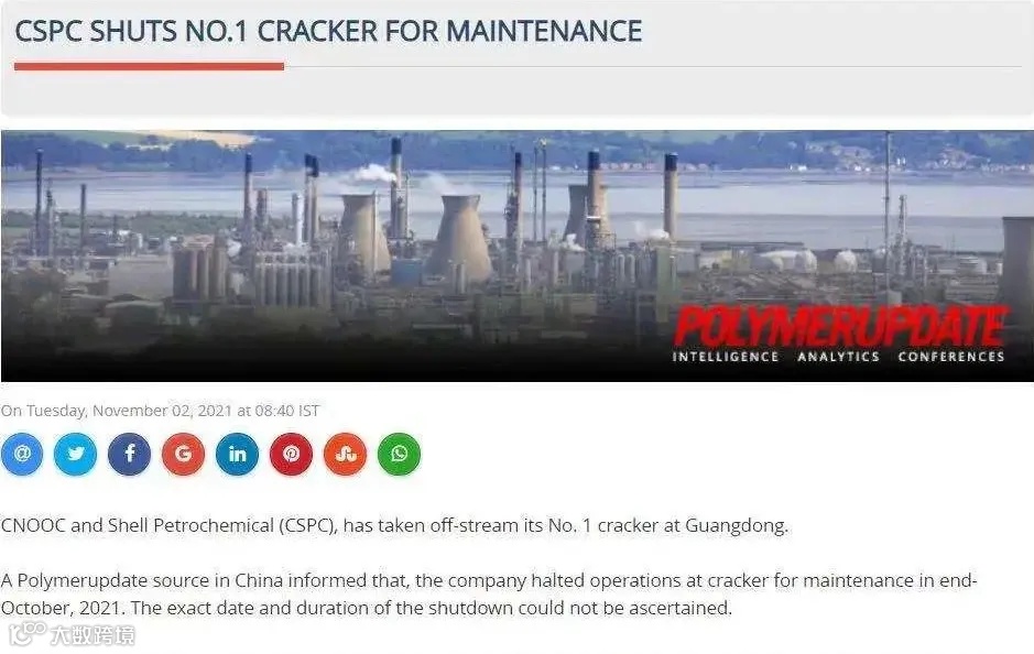 据外媒报道,总部位于新加坡的石油化工生产商壳牌(Shell)因技术问题,其位于普劳布库姆(PulauBukom)的裂解炉在11月1日发生火灾,据悉该公司已通知部分乙烯和丙烯买家供应减少。有市场人士表示,该裂解装置目前已下线,并将进行持续一周的维护。
