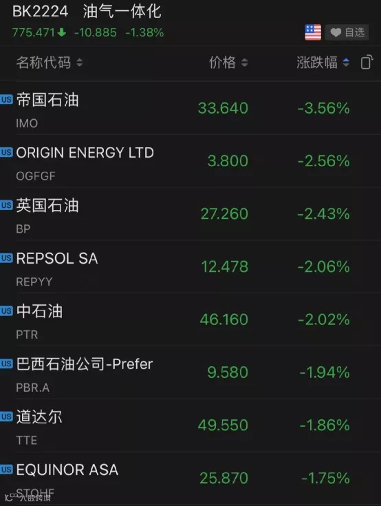股市方面,埃克森美孚跌1.37%,雪佛龙跌0.7%,康菲石油跌0.42%,斯伦贝谢跌0.69%,西方石油跌1.48%。