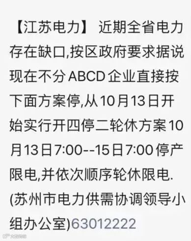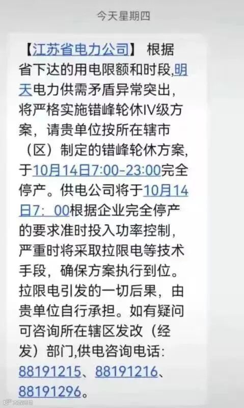 近期,在能耗“双控”和电力供需矛盾异常突出的叠加影响下,江苏省对化工等高能耗企业的限电措施进一步加严。江苏电网公司从10月9日起对限电政策进行调整,现对有序用电工作要求如下: