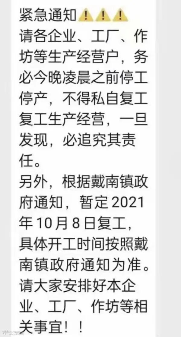 国不锈钢名镇、兴化市第一大镇戴南镇企业收到的通知显示,“暂定2021年10月8日复工。”