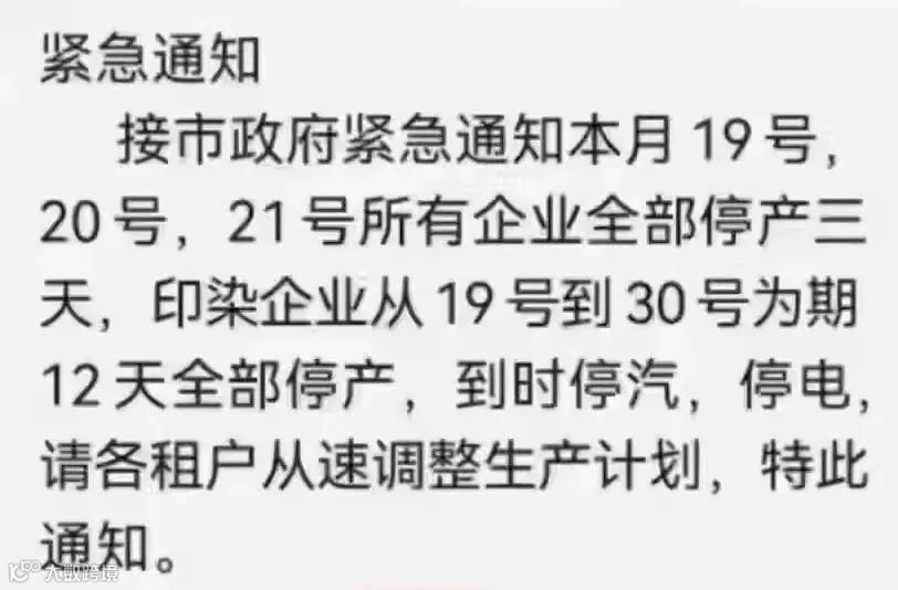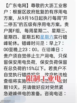 绍兴柯桥发布了停电通知,“根据9月20日全省紧急会议精神和省政府主要领导指示精神,要求全省立即对高耗能重点用能企业实行用电降负荷。各地要在确保安全的前提下高耗能重点用能企业停产至月底。9月21日11时前未关停的高耗能重点用能企业,将由电力部门采取措施。共涉及我区161家企业,全部印染、化纤行业企业。请各镇(街)通知企业按要求执行,马鞍街道要通过热电企业立即降低供热负荷,以供热负荷降低情况有序安排用热企业梯次停产。”