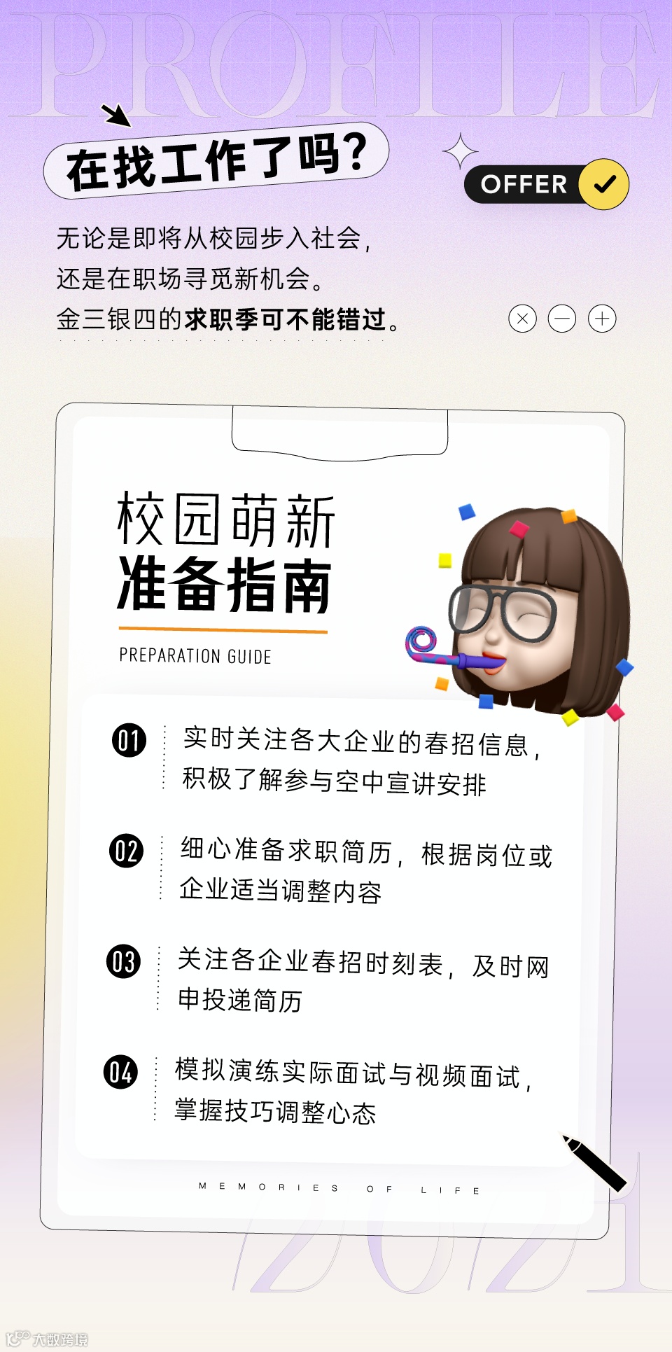 对即将离开校园的求职萌新来说,首先当然是要对春招的信息有足够的关注度。这样才有机会进入心仪的企业,为自己的职场开个好头。