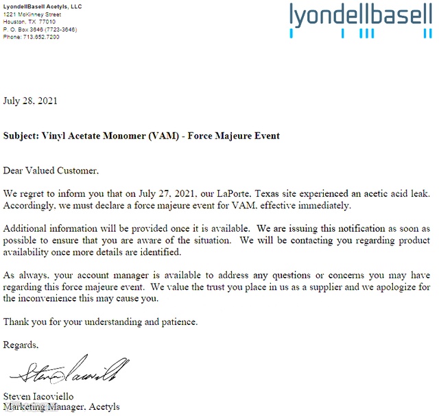 巴斯夫:欧洲洪水破话了当地的油管,影响巴斯夫荷兰地区LDPE的乙烯供应,巴斯夫此前宣布荷兰地区LDPE不可抗力升级,近期宣布其在欧洲地区的整个PE生产均遭遇不可抗力。