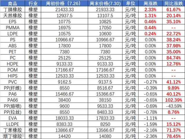 2021年第30周(7.26-7.30)大宗商品价格涨跌榜中橡塑板块环比上升的商品共5种,涨幅前3的商品分别为丁腈橡胶(2.33%)、天然橡胶(1.31%)、EPS(0.46%)。