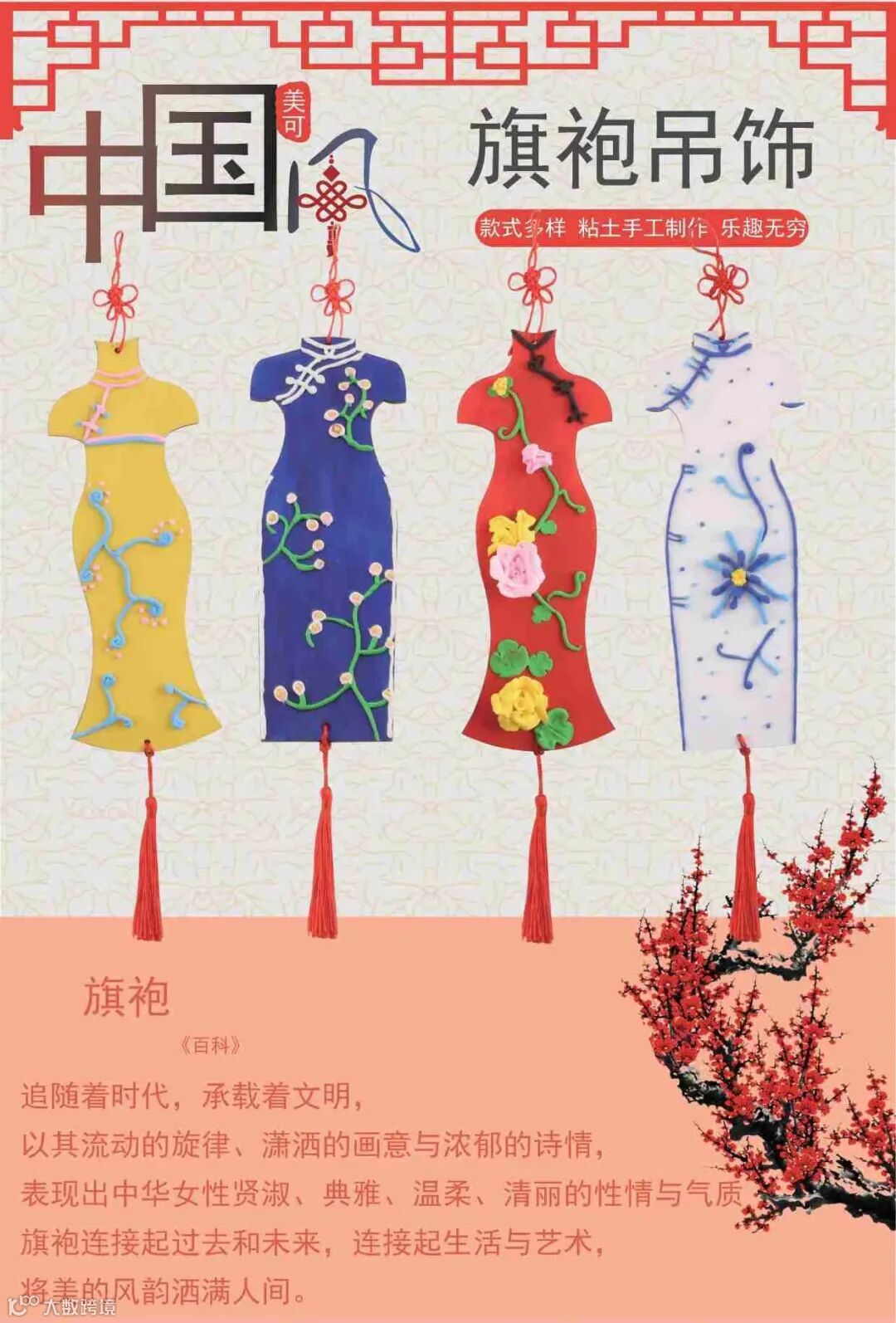 旗袍连接过去和未来,连接生活与艺术,将美的风韵洒满人间。国风旗袍古典吊饰手工,既可促进小朋友大脑操作,还能锻炼小朋友动手能力。