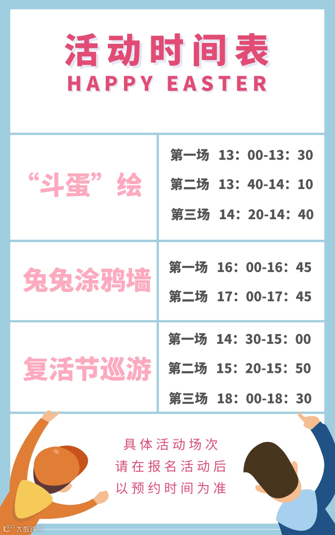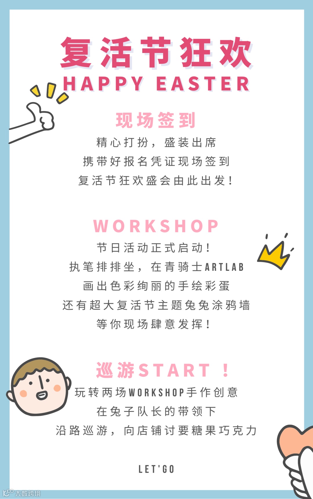 本场活动共分为两场三个项目,创意彩蛋和涂鸦墙后,还有扮成兔子人偶的小队长带领小朋友和家长们现场巡游哦~