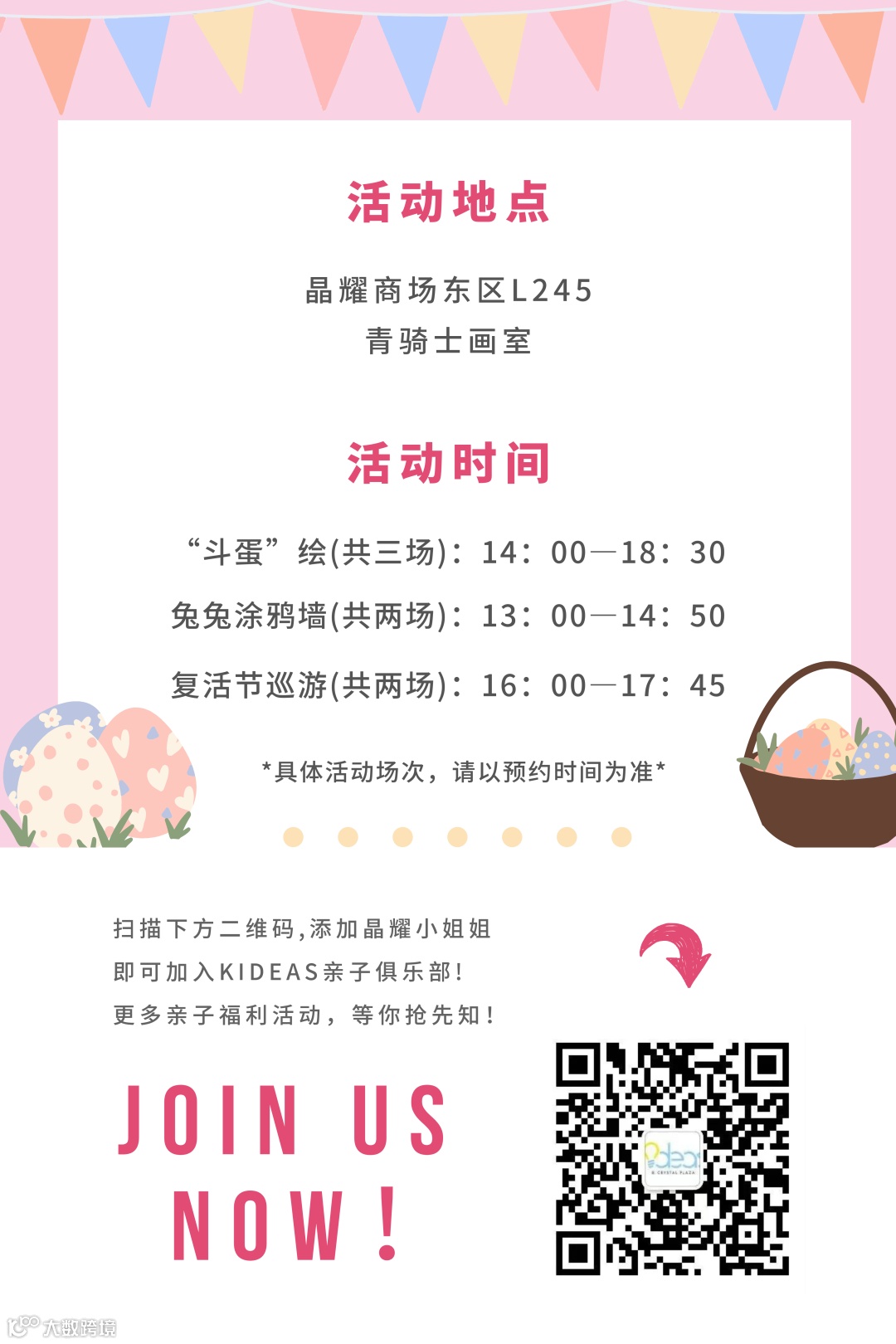 KIDEAS亲子俱乐部复活节狂欢会即将开始啦!这次我们收起户外徒步的探险之心,一起盛装出席,玩点室内的!