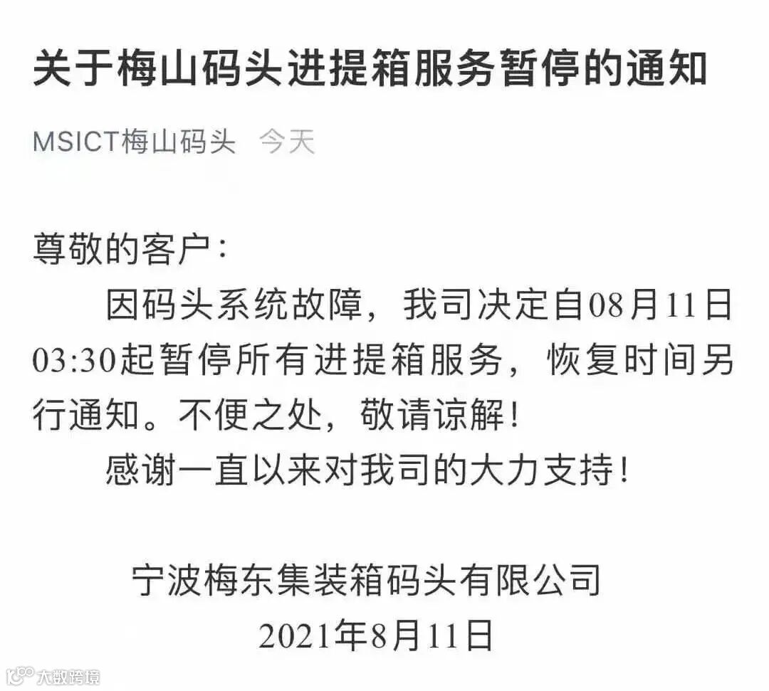 此外,宁波梅东集装箱码头有限公司11日发布公告表示,因码头系统故障,该公司决定自当日3时30分起,暂停所有进提箱服务,恢复时间另行通知。
