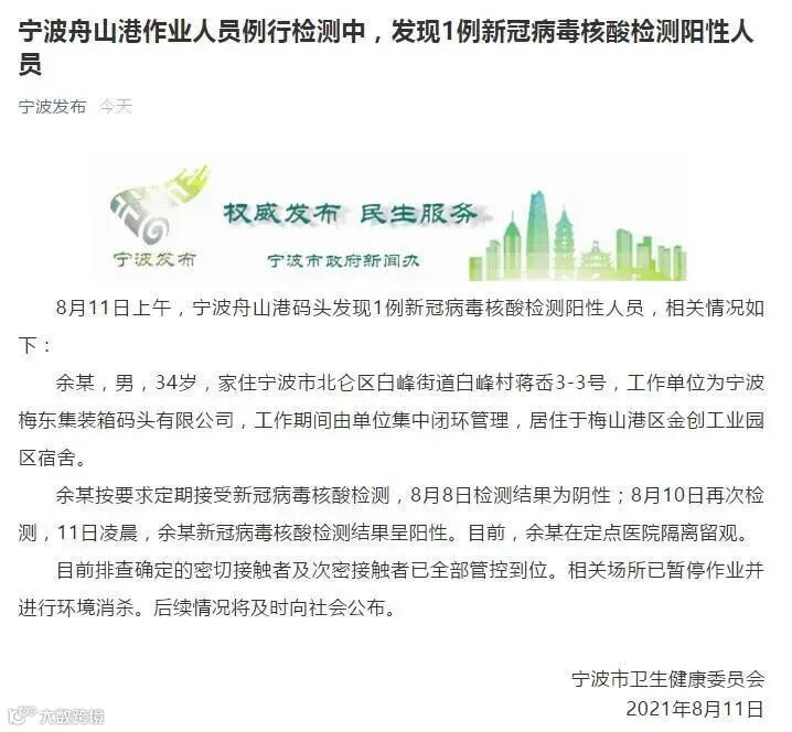 来自宁波市卫生健康委员会(简称宁波卫健委)8月11日发布的消息显示,在宁波舟山港作业人员的例行检测中,发现一例新冠病毒核酸检测阳性人员,目前,在定点医院隔离留观。相关情况如下: