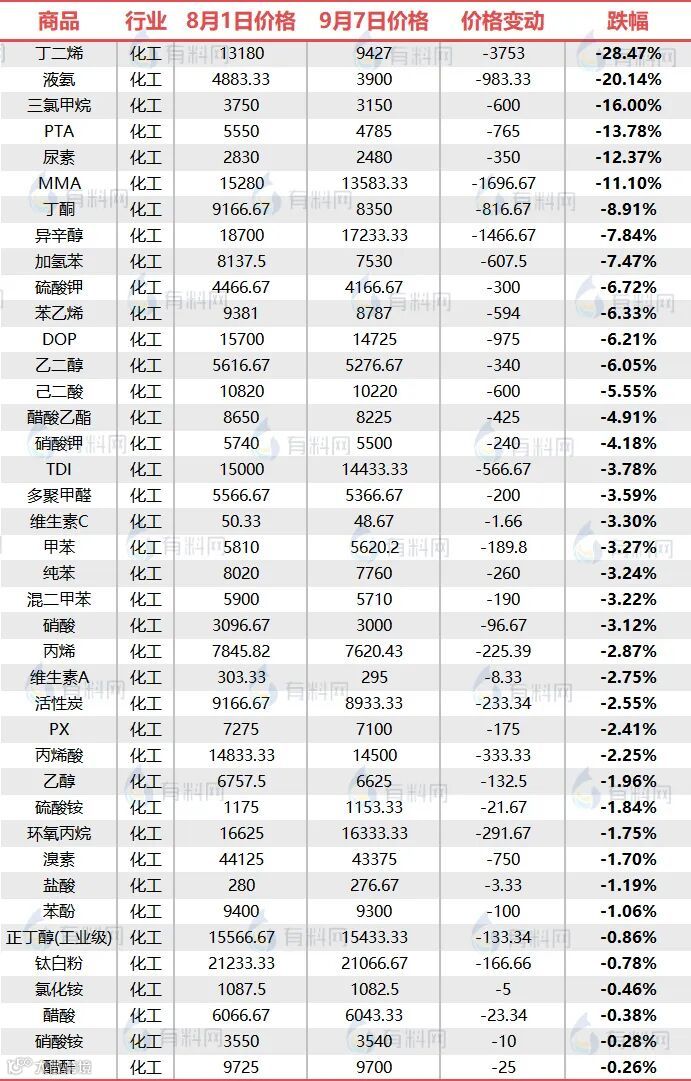 40余种化工品价格走低