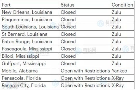 新奥尔良、普拉克明斯、南路易斯安那州和圣伯纳德在内的港口均在周六关闭货限制出货。
