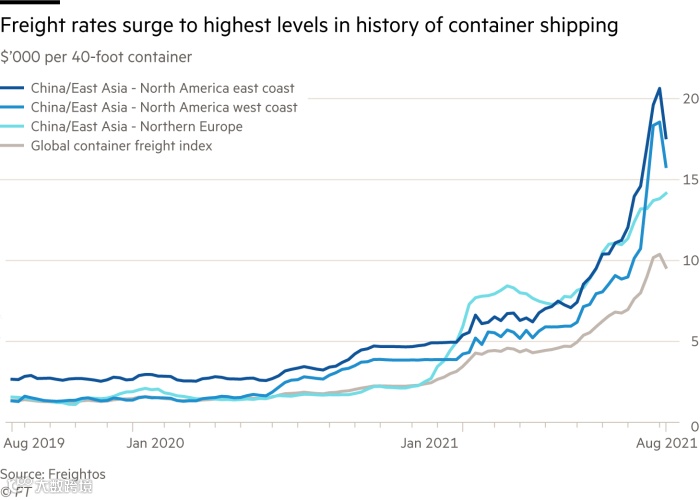 据Freightos的数据显示,现在一个40英尺的集装箱从中国运至美国西海岸的价格为15800美元,该价格比上月上涨了50%,相比疫情前上涨10倍!
