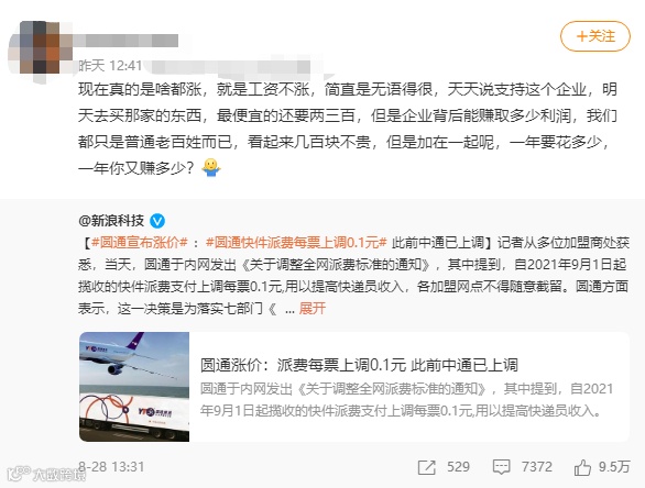 9月1日起,中通、圆通、申通、百世、韵达、极兔等6家快递企业全网末端派费每票上涨0.1元。