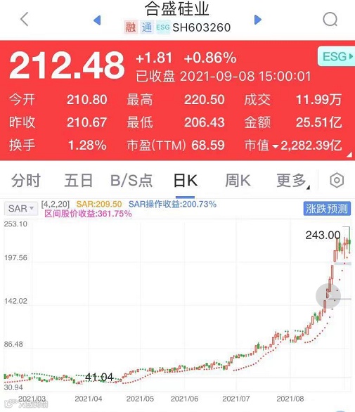 现货市场的火热引燃到有机硅股市板块,有机硅板块相关上市公司本月出现了不同程度上的上涨,以合盛硅业为例,该上市公司从4月份41元/股一路狂飙至今日(9月8日)的212.48元/股,涨幅高达417%!