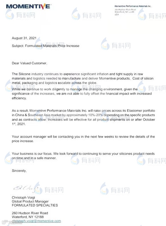 迈图宣布,在中国和东南亚市场的有机硅弹性体产品组合的价格提高约10%-20%。适用于2021年10月1日或之后的所有产品发货。