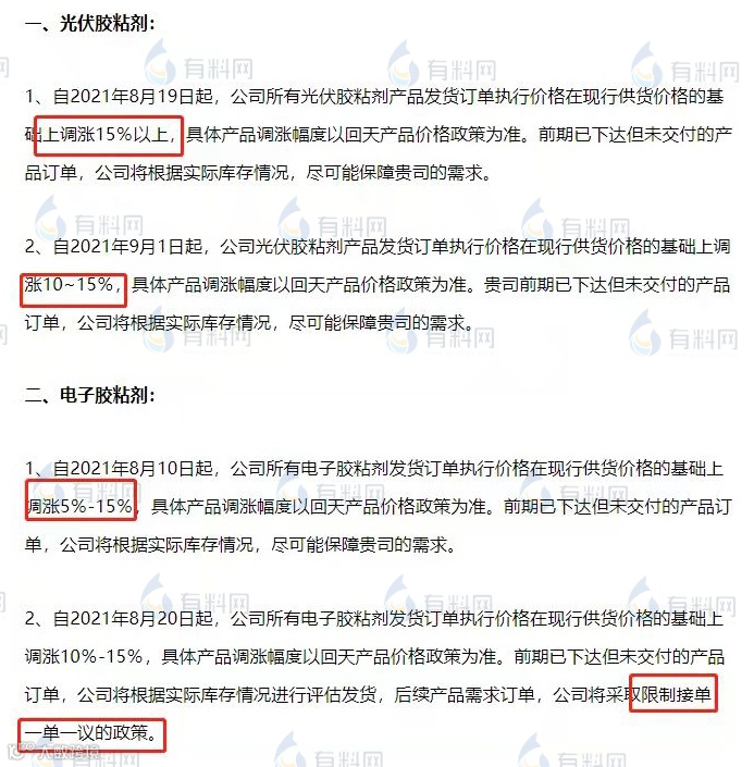 除之江外,硅宝科技、集泰股份、广州白云等巨头也同步发函上调产品价格,且涨价通知均在2次及以上,累计涨幅达20%-30%。