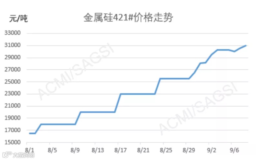 9月8号,金属硅价格又涨500,达31000元/吨,在3万+的路上越走越远。该产品8月以来环比涨幅达87.9%,目前还是一天一价,丝毫没有停下来意思。