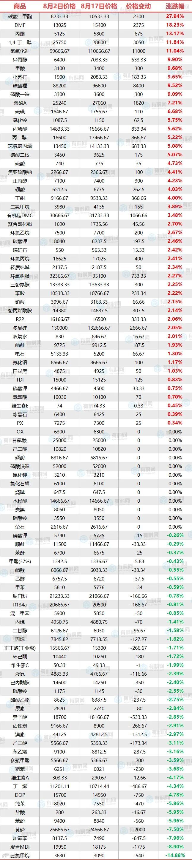 8月17日,北美地区另一大化学品供应商伊士曼发布涨价函称对9月1日起上调乙二醇系列、丙二醇系列、醋酸系列、增塑剂系列及部分溶剂/助剂等12种重要化工原材料的价格,涨幅为最高达0.15美元/磅(约2142元/磅)。
