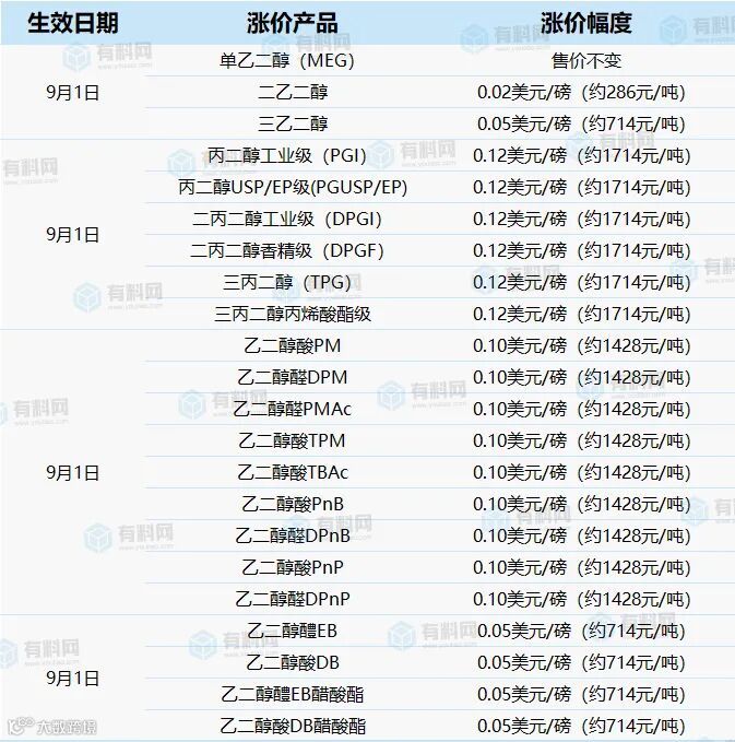 此外,该公司还于8月11日上调了全等级全系列丙二醇系列产品的售价,涨幅均在0.06美元/磅(约857元/吨)。