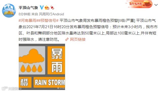近日平顶山市发布暴雨橙色预警、雷电黄色预警等预警新号。
