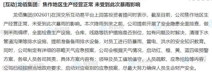 钛白粉龙头企业龙蟒佰利在东方财富回复称,公司焦作地区生产经营正常,未受到此次暴雨的影响。本次降雨到来之前,公司提前开展了安全隐患全面排查,做到未雨绸缪,全面检查生产设施、仓库、线路等防护措施是否到位,如有问题及时解决,清理下水管道沟渠等排水设施,提前准备备用排水设备,对员工进行防暴雨、雷电、洪水的安全知识教育。同时,公司制定有详细的恶略天气应急预案,公司会根据天气情况,启动红、橙、黄、蓝四级预警方案,各级人员各司其责,具体方案内容有:领导及员工值班值守、人员疏散、应急抢险等内容,公司已经按照当地政府要求,启动对应级别的应急预案,尽最大努力确保人员生命财产安全。