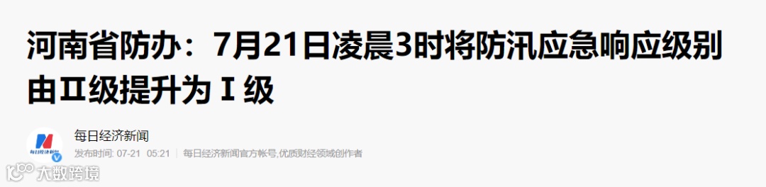 河南省防汛抗旱指挥部决定于7月21日凌晨3时将防汛应急响应级别由Ⅱ级提升为Ⅰ级。