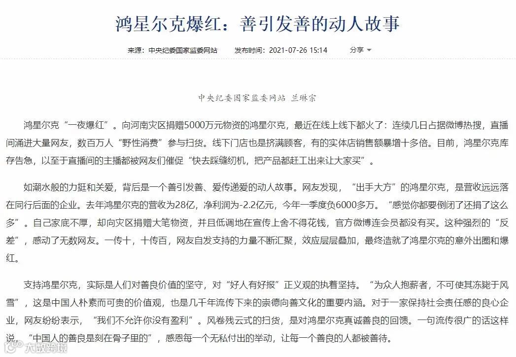 26日下午,中纪委官网刊文提及近日备受关注的鸿星尔克。