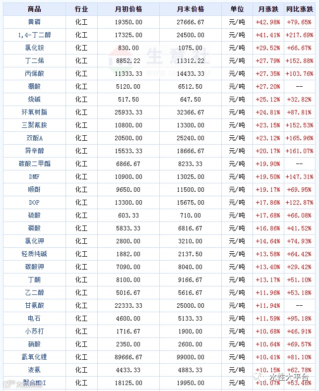 涨幅前3的商品分别为黄磷(42.98%)、1,4-丁二醇(41.41%)、氯化铵(29.52%)。