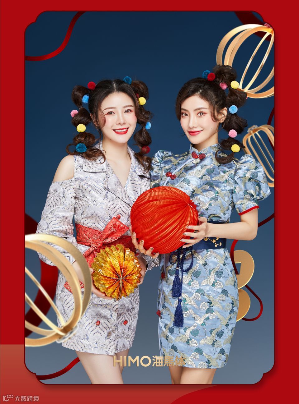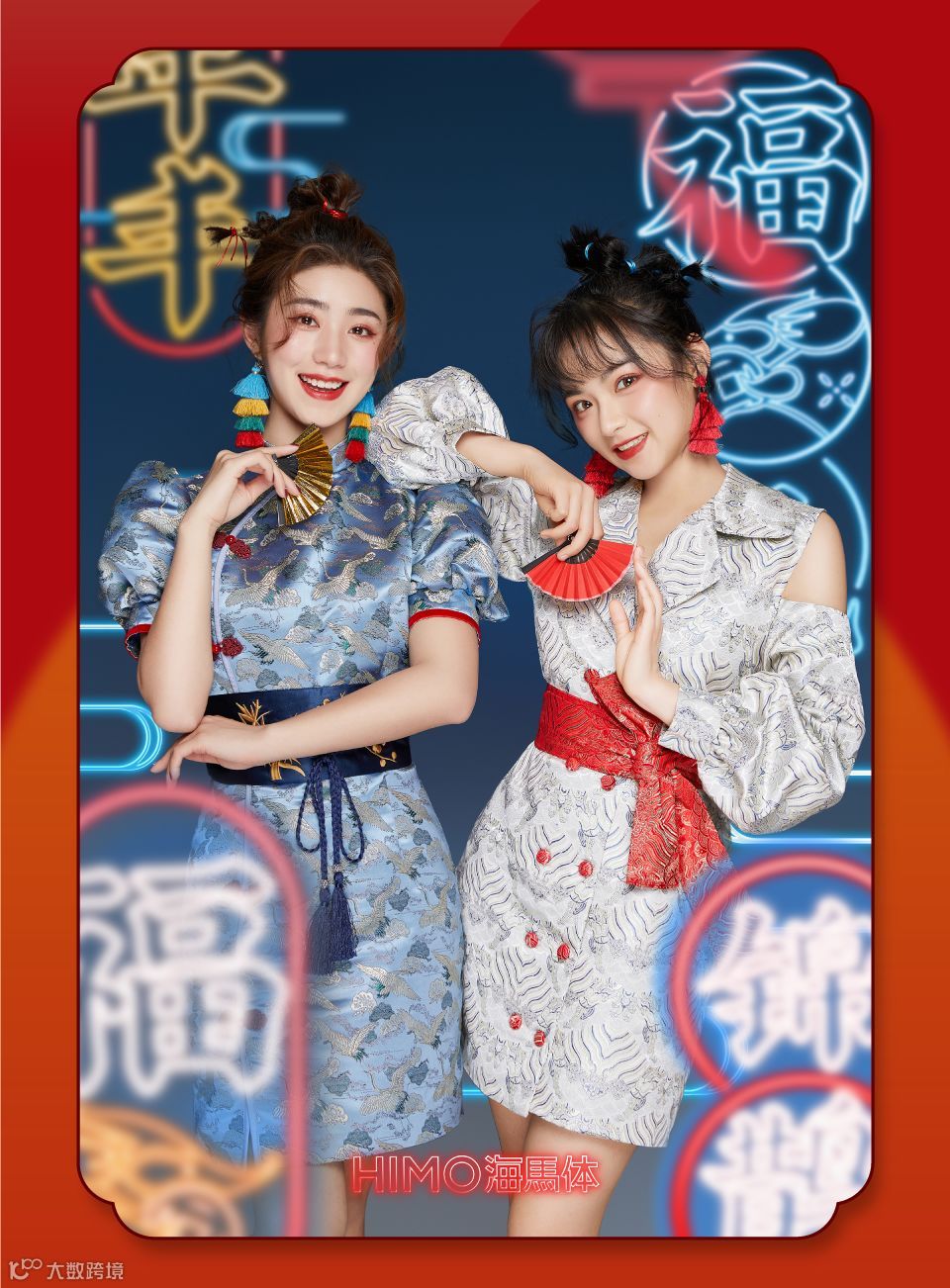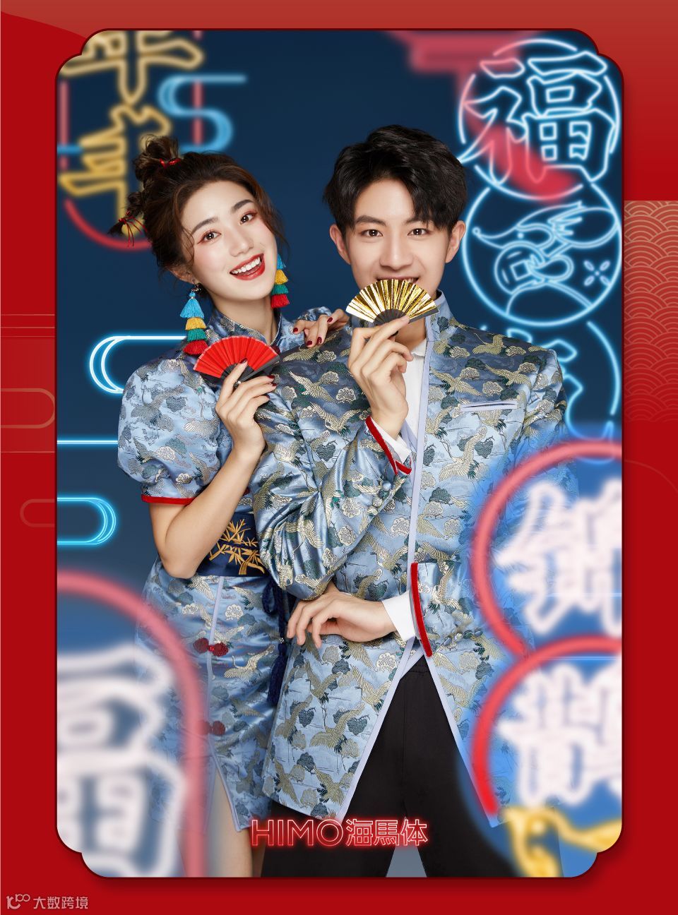 蓝色泡泡袖的新式旗袍,搭配吉祥松鹤纹案,新式款型与传统图案的结合,时尚中蕴含着中式吉祥。灯笼和折扇的道具,则把新年的喜庆和潇洒尽显。