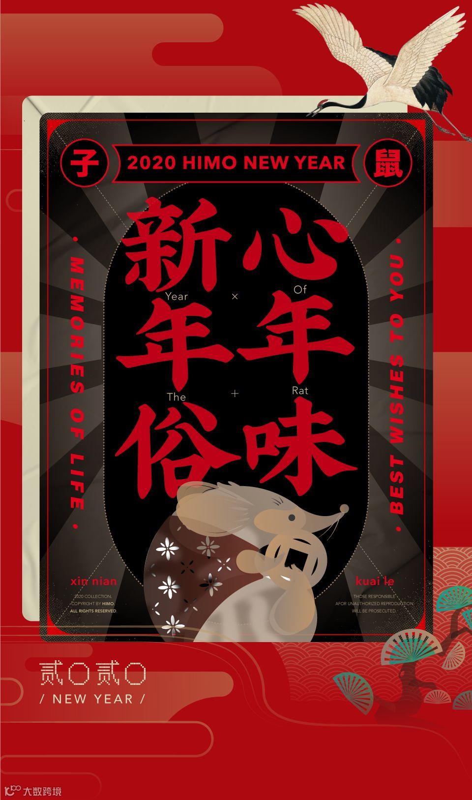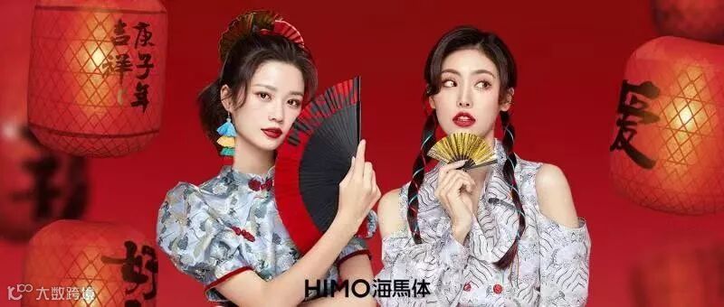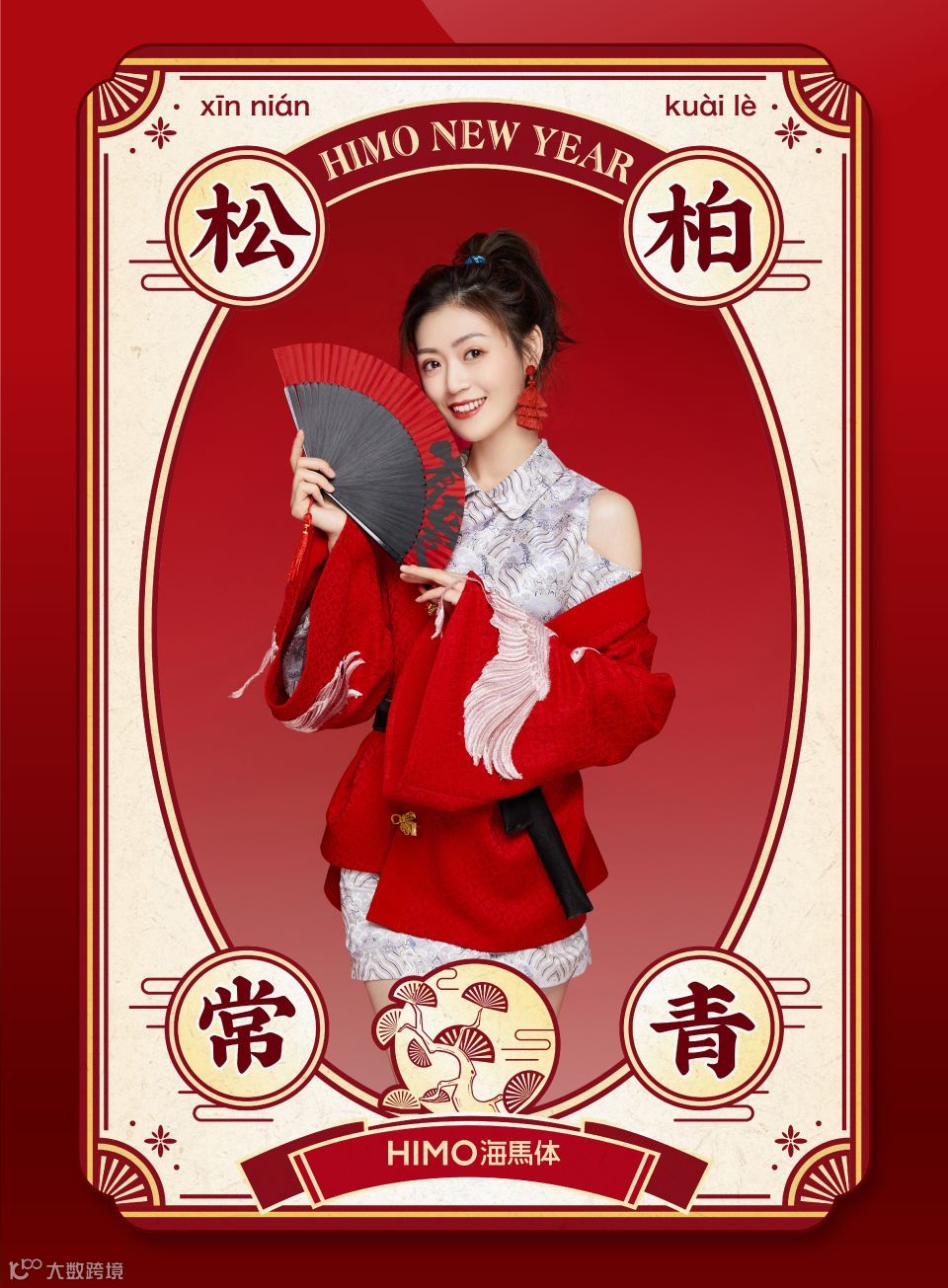 蓝色泡泡袖的新式旗袍,搭配吉祥松鹤纹案,新式款型与传统图案的结合,时尚中蕴含着中式吉祥。灯笼和折扇的道具,则把新年的喜庆和潇洒尽显。